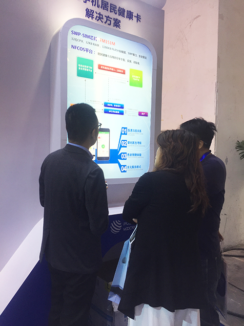 我司展臺前,本次展出的手機(jī)居民健康卡方案引起廣泛矚目。大量觀眾和專業(yè)人士前來咨詢并進(jìn)行深度洽談。復(fù)旦微電子手機(jī)居民健康卡解決方案是是基于手機(jī)NFC技術(shù)的移動居民健康卡方案。該方案采用復(fù)旦微電子FM151M安全加密芯片,電信運(yùn)營商發(fā)行手機(jī)NFC SIM卡,通過衛(wèi)計委TSM平臺和電信TSM平臺,加載居民健康卡應(yīng)用實現(xiàn)一卡多用。目前已經(jīng)在上海、湖北兩地得到成功應(yīng)用。
